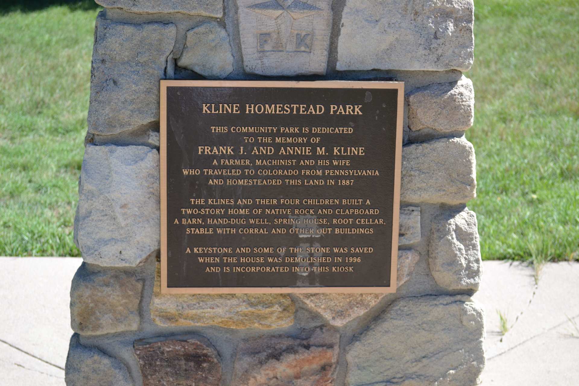 Some of the stone from the house was saved and used to build the monument also pictured here. Kline Park in Highlands Ranch is a tranquil community park featuring a playground, open green spaces, and scenic walking paths. It’s a great place for outdoor activities, picnics, and enjoying the natural surroundings in a peaceful setting.